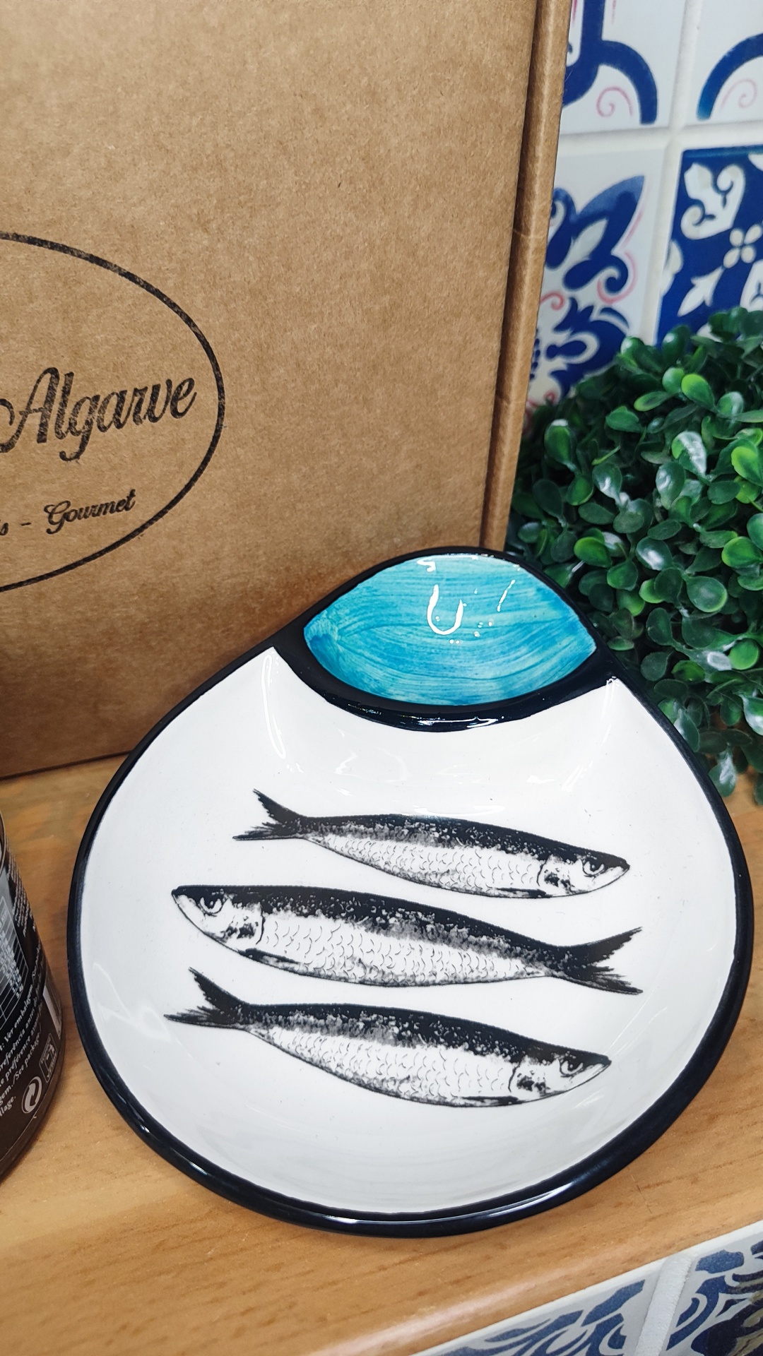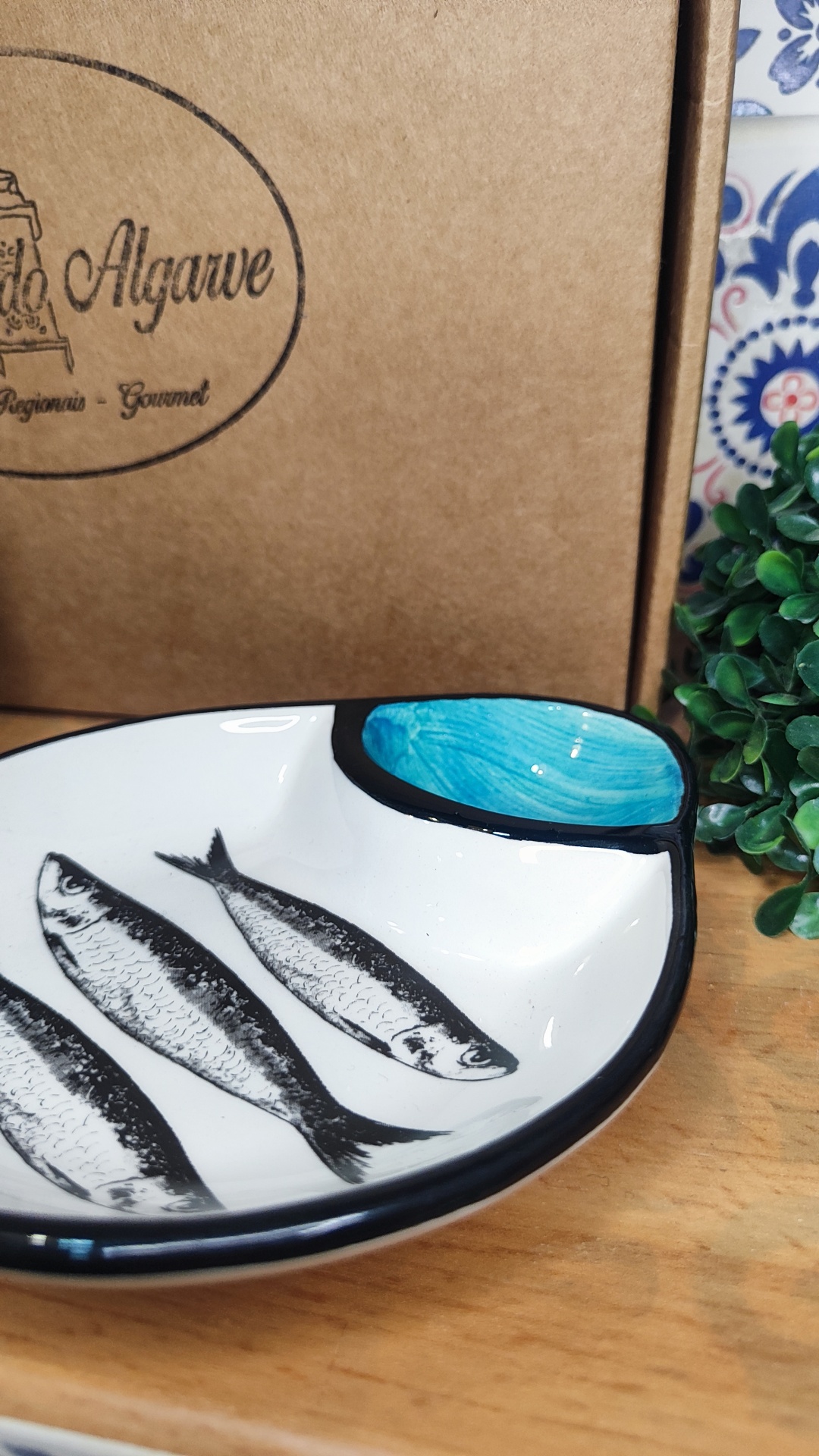 Azeitoneira em Cerâmica com Sardinhas e Pintura Manual Azul Turquesa